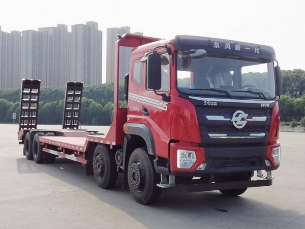 Dongfeng Huashen 8X4 concave trailer, with innovative design, ultra-low height, good stability performance, Yuchai 350 horsepower engine, Faust 12 speed gearbox, wheelbase of 1850+5800+1350, front axle of 5.5 tons, widened rear axle of 13 tons, 10.00 steel wire tires, new sedan level luxury interior workbench, 10 inch super multifunctional screen, reverse image, original air conditioning, remote lock multiple lock in one, multifunctional steering wheel, airbag seats, LED daytime running lights, vehicle size 12000X2550X3200mm