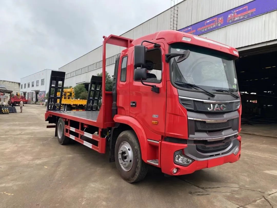 A5L semi high top cab, with 220 horsepower in the cloud, a Fasttech 8-speed gearbox, a 245mm double-layer beam, an 8-ton rear axle, and 10.00R20 steel wire tires. Standard configuration includes electric doors and windows, central locking system, air conditioning, driver airbag seat, and driving recorder. The wheelbase is 4500mm, the overall dimensions of the vehicle are 8375 × 2550 × 3200mm, and the corresponding plate length is 5.9 meters. Optional single or double section hydraulic ladder. The total weight is 18 tons and the rated load is 11 tons. It is suitable for the transportation and transfer of mechanical equipment such as excavators, forklifts, pipe jacking machines, pile drivers, loaders, harvesters, etc. with a capacity of less than 15 tons!
