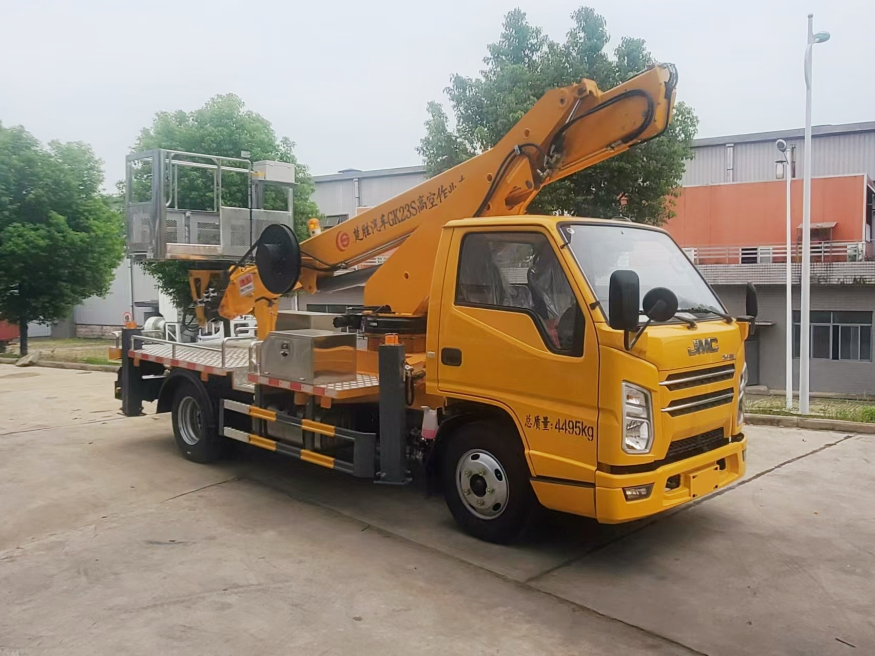 1) The homework height is 23 meters, with a telescopic arm and a working bucket limit of 200kg. The platform has a hydraulic 360 degree full rotation, and the working bucket can rotate left and right 90 degrees with automatic hydraulic leveling. The hydraulic system has proportional control, and the turntable and working bucket can be operated in two positions,